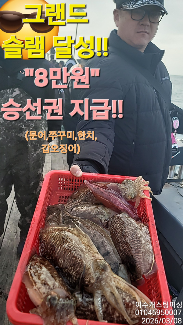 | 제목 : 여수캐스팅피싱호 > [ 26년 3월 8일 수온이가 높네요..;; 심해갑오징어 첫 조황!! ] | ||